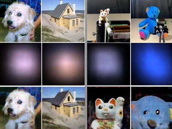 The first row is the ground truth scenes used to test the proposed lensless camera. In this row, the two leftmost columns are targets displayed on an LCD display, while the two rightmost columns are real objects in three-dimensional space. The second row shows the pattern captured by the lensless camera. The third row is the most informative here, as it depicts results using the proposed reconstruction technique. The fourth row shows results using a model-based approach, which has been traditionally used with lensless cameras. The fifth and final row relies upon convolutional neural networks, which as mentioned, have limitations with global image reconstruction.