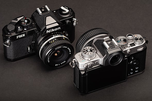 The retro-styled Nikon Z fc (R) alongside one of the cameras that inspired it, the film-era FM2.