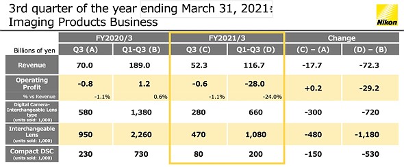 Nikon’s Imaging Products Business revenue for FY2021 Q1-Q3 was ¥116.7B / $1.1B, down 38% (¥72.3B / $685M) year-over-year (YoY). During that same time, Nikon’s operating loss amounted to ¥28B / $265M, a decrease of ¥29.2B / $277M for the same period last year, which still showed an operating profit, albeit a relatively small one (¥1.2B / $11.3M). While the massive drop in operating profit doesn’t look promising, Nikon does note ¥16B / $151M of that loss was ’fixed asset impairments and disposal/write-down of inventory in Q2 and Q3, and ¥1.9B [$18M] of restructuring relevant expenses.’