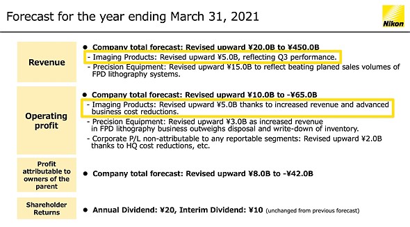 | A section of notes from Nikon’s presentation that shows (highlighted yellow) its thoughts on its Imaging Products Business through the remainder of FY2021. Click to enlarge. |