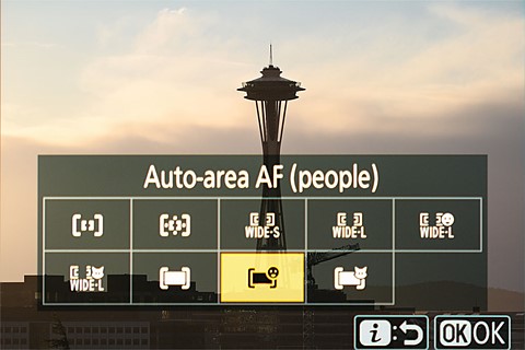 | People or Animal detection are available as variants of Wide-L and Auto Area modes. You can limit which AF area modes are accessible if you want to make mode selection quicker. |