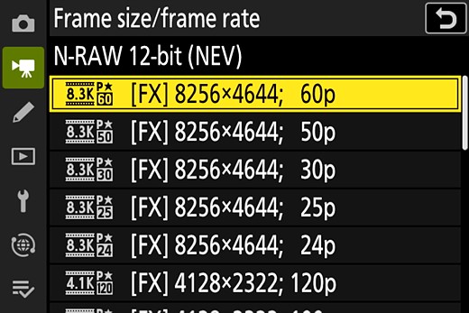The Z9 can shoot at up to 8K/30p, oversampled 4K (from 8K capture) at up to 60p or less-detailed 4K at up to 120p taken from the full width of the sensor (either binned or line-skipped). There’s also an 8K/60p option in the camera’s proprietary N-Raw format.