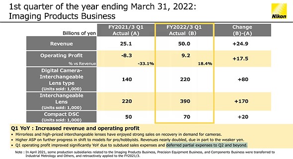 Nikon’s Imaging Products Business shows revenue of 50 billion yen ($457 million) and an operating profit of 9.2 billion yen ($84 million). That’s up 24.9 billion yen ($228 million) and 17.5 billion yen ($160 million), respectively, compared to the same quarter last year (Q1 FY2021). Nikon says the increase in revenue is ‘due in part to the weaker yen’ and notes its Q1 FY2022 operating profit was ‘significantly’ higher due to ‘deferred partial expenses to Q2 and beyond,’ suggesting we might see a future impact as these expenses are realized throughout the rest of the year.