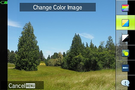 When the 3″, 1.04 million-dot display is flipped down, the camera switches into a selfie mode, which puts virtual shutter release, movie capture and ‘brightness’ (exposure comp.) buttons on the screen. There’s also a button that turns on a two second self-timer that takes three photos in a row, and in Auto mode, a new One-Touch e-Portrait button that yields artificially-smoothed, plasticky-looking skin.