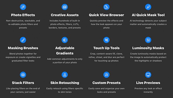 | The primary features of ON1 Effects 2021 includes photo effects, an AI Quick Mask tool, masking brushes, luminosity masks and more. Click to enlarge. Image credit: ON1 |