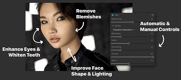 | You can use ON1 Portrait AI 2021 to remove blemishes, enhance eyes and teeth, and improve face shape and lighting. Image credit: ON1 |