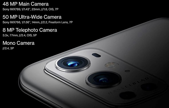 | The OnePlus 9 Pro has four cameras, including a 48MP main camera and 50MP ultra-wide camera. |