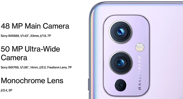 | The OnePlus 9 has three cameras, including a slightly different 48MP main camera than the OnePlus 9 Pro and the same 50MP ultra-wide camera. |