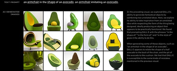 | An armchair in the shape of an avocado might not be the most practical of comfortable furniture, but DALL-E clearly understood the prompt. Click to enlarge. Image credit: OpenAI |