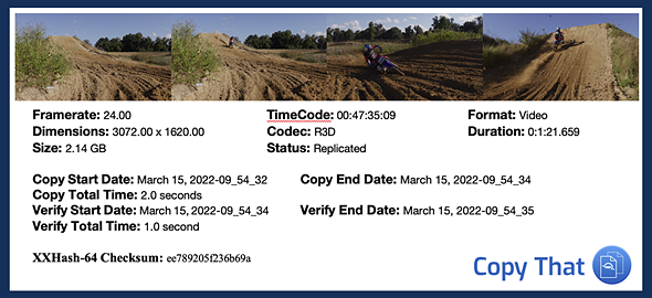 When the transfer is complete, Copy that will produce a detailed report, complete with thumbnails of the media and all pertaining information, for users to download as a CSV, MHL, PDF or TXT file as a receipt of sorts to show no data was corrupted or forgotten in the transfer. Those reports are also stored in a Job Archive to reference later if needed.