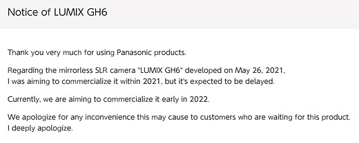 Panasonic says it is ‘aiming for [the GH6’s release] in early 2022’ and says it ‘apologize[s] for any inconvenience caused to customers waiting for this product.’