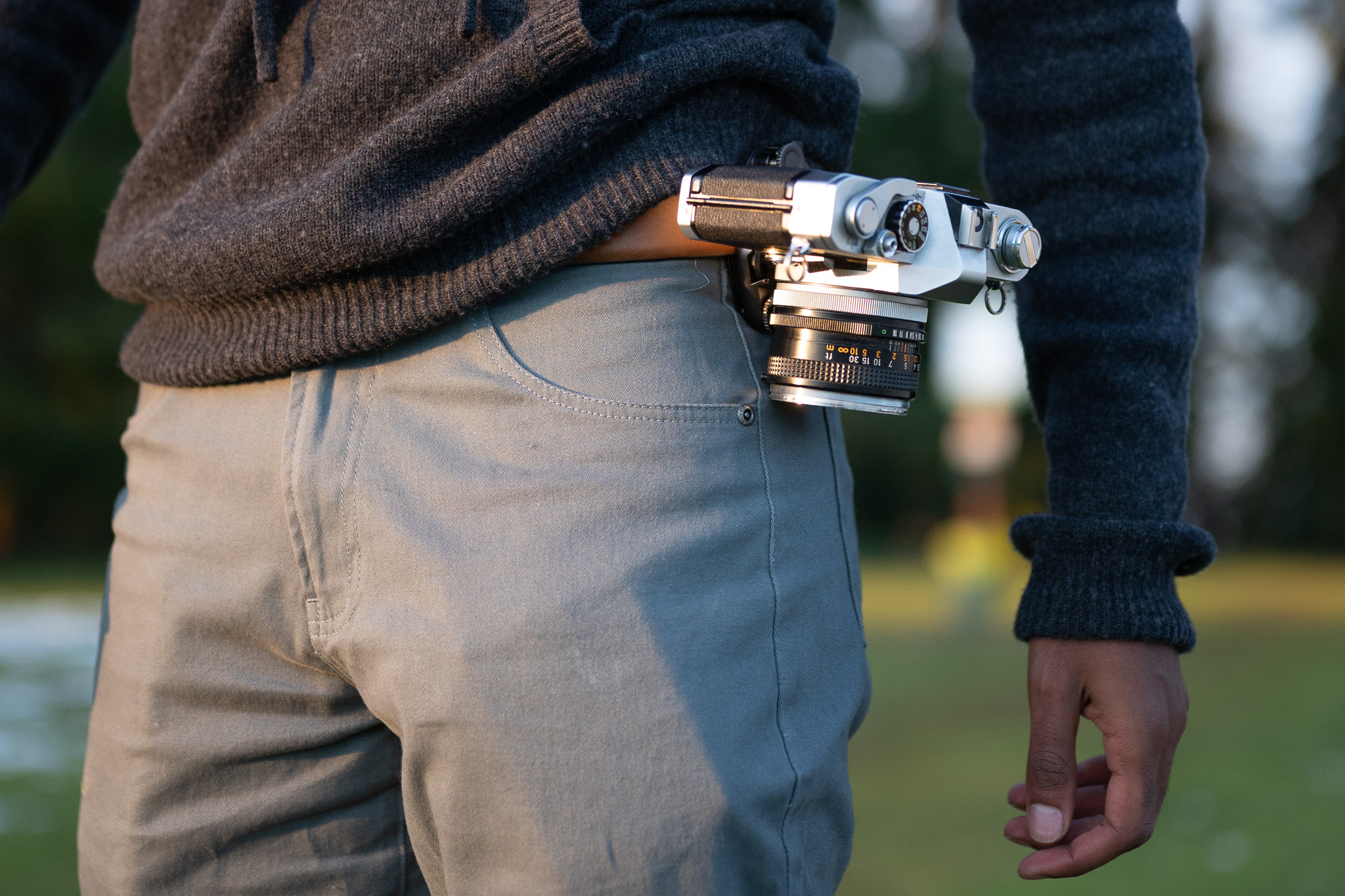 This option eliminates the sideways extension at the hip issue. By positioning the Capture Clip just inside either leg, one’s camera becomes easily accessible with less fear of damage. I also find that because the lens isn’t off to either side, walking movements are largely unimpeded. This is often how I use the Capture Clip, at least when my camera is light enough that it’s not uncomfortable to attach it to my belt in the first place.