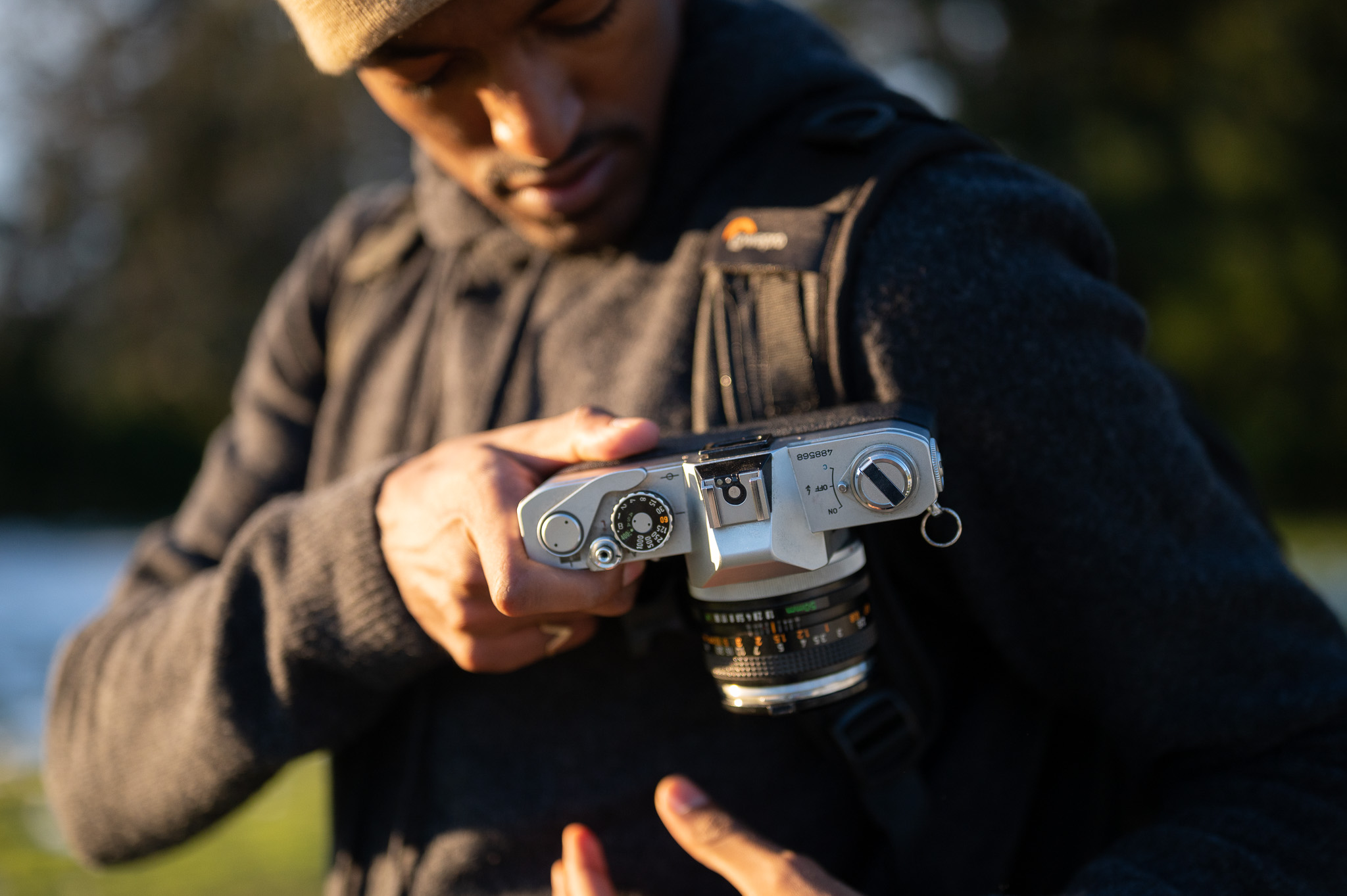 The main drawback of harnesses, in my experience, is how cameras dangle when not in use. This makes me worry that my cameras might swing into something, or into each other, which is anxiety-provoking and distracting. And similarly, when I kneel down to grab gear, the dangling camera in a harness can swing down toward what I’m reaching for (and sometimes all the way down to the ground).