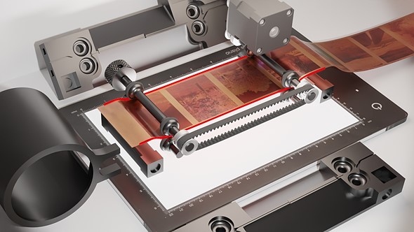 Once the film is loaded the user can micro-adjust its position before the first frame is recorded, and then use a button to tell the carrier what format is being used so it can keep the frames aligned under the camera as they advance. The carrier needs to be placed over a light box, and the camera positioned directly above on a copy stand or a tripod.