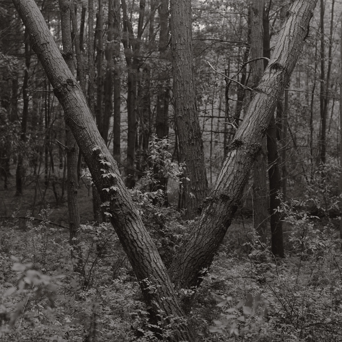 Back in the glorious year of 2020, my girlfriend and I decided to drive up to my family’s cabin in northern Pennsylvania rather than our usual trip to Acadia (for obvious reasons). It was while walking along the road leading into the property, looking for ferns or other intimate subjects to photograph, when I came across two trees, each leaning quite heavily to opposing sides. The scene was interesting and I felt as though the composition would make for a fine photograph, though I wondered if something was missing. Knowing I had a finite amount of film and no way to restock it at the cabin, I decided against making the photograph.