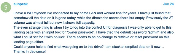 Some users are unable to log in and data has been deleted. Image credit: WD forums |