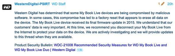 In a statement to customers, Western Digital states that a malicious actor is behind the issue. ‘Western Digital has determined that some My Book Live devices are being compromised by malicious software. In some cases, this compromise has led to a factory reset that appears to erase all data on the device. The My Book Live device received its final firmware update in 2015. We understand that our customers’ data is very important. At this time, we recommend you disconnect your My Book Live from the internet to protect your data on the device. We are actively investigating and we will provide updates to this thread when they are available.’