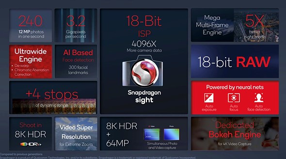 Qualcomm says the new triple-ISP array can support up to 30 frames per second (fps) stills shooting with three 36MP cameras, one 64MP camera and one 36MP camera or a single 108MP camera, all with zero shutter lag.