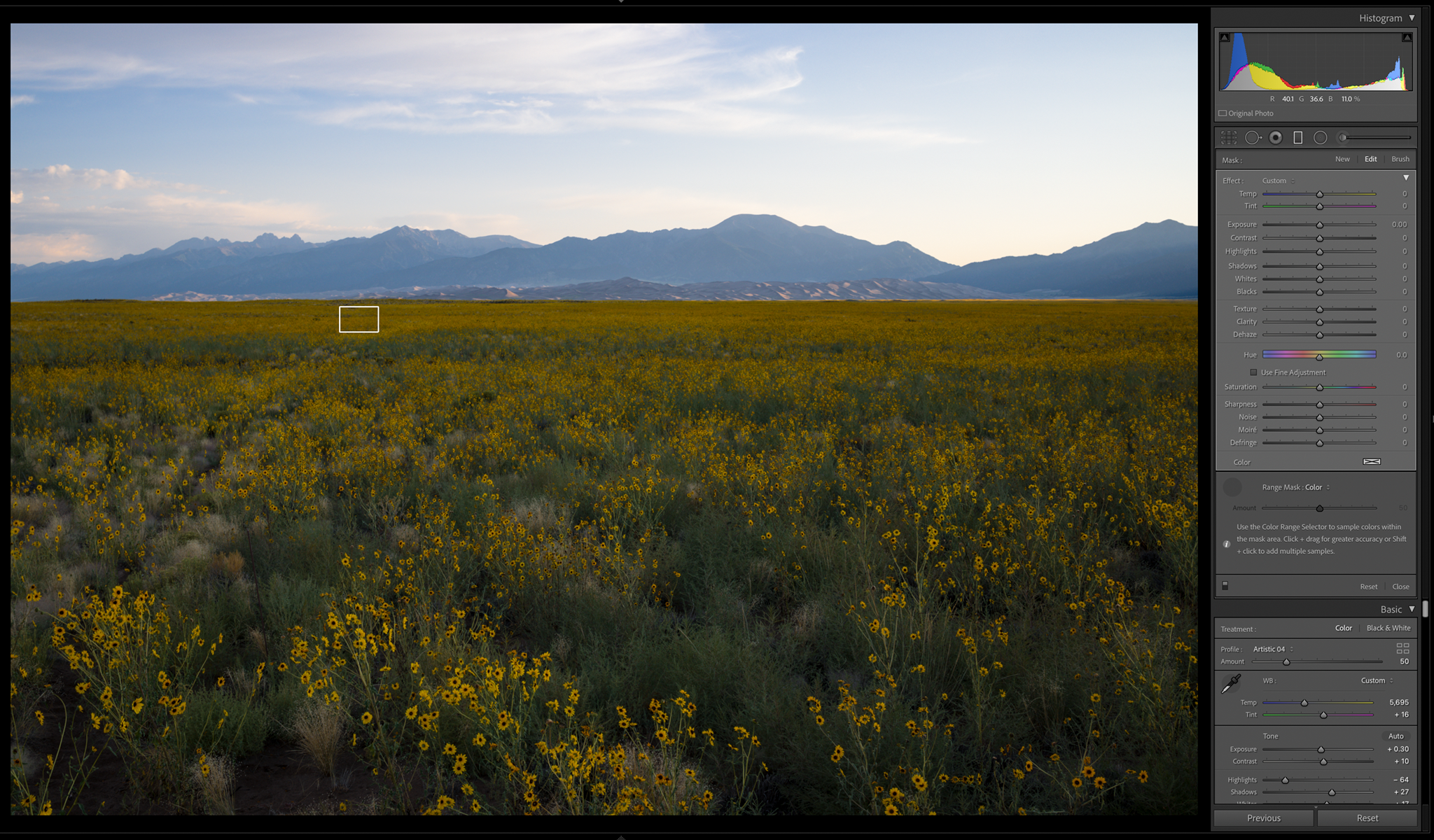 I couldn’t use the HSL panel for the image above because it was adjusting the yellow colors in the sky as well (and adding some color noise). A standard gradient tool – with or without luminance masking – wasn’t a terrible option, but it selected a bit too much of the flowers’ stems for my taste. So, the color range mask was the way to go.