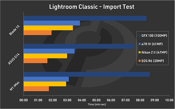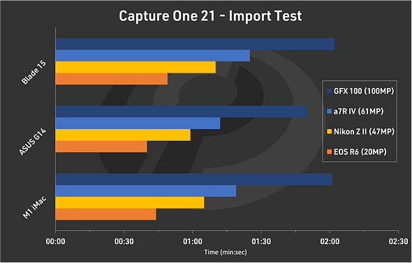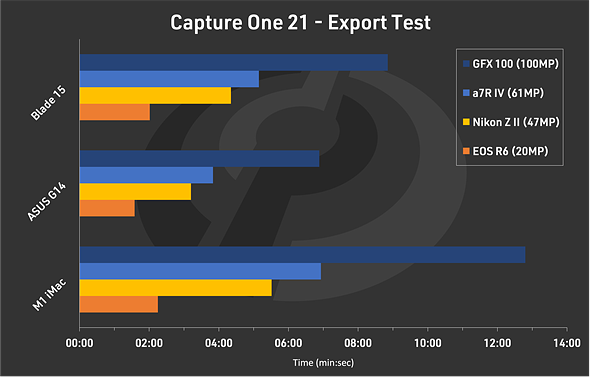 Since Capture One creates smaller 2560px previews by default, with no option to create 1:1 preview like Lightroom Classic, RAM plays a smaller role when importing and generating previews. As a result, the Blade’s 10th Gen Intel Core i7 falls behind both the AMD Ryzen 9 5900HS and the Apple M1 SOC across the board: