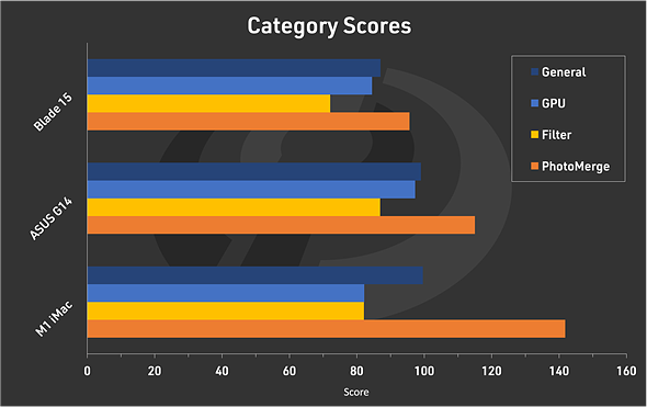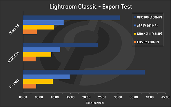 The rest of your hardware isn’t irrelevant. You’ll notice that the ASUS G14 with its weaker NVIDIA RTX 3060 GPU but faster CPU and faster RAM still takes the crown in every category. But at least the Blade 15’s powerful GPU isn’t going to waste like we see in Lightroom Classic. The iMac, on the other hand, simply can’t keep up: