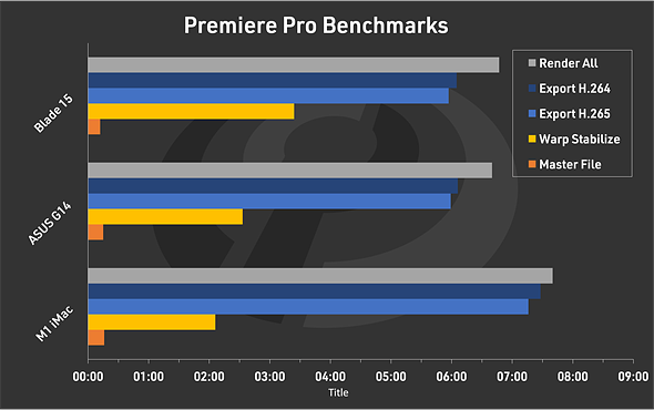 Whether you’re simply compiling previews into a master file, encoding H.264, or encoding HEVC, the Blade 15 eked out a few percentage points over the AMD-based ASUS G14 and a significant 18% to 25% lead over the 2021 iMac. It’s also faster than the M1 when rendering, though both the ASUS and Blade fall short of the iMac when applying Warp Stabilize to a 15-second clip.