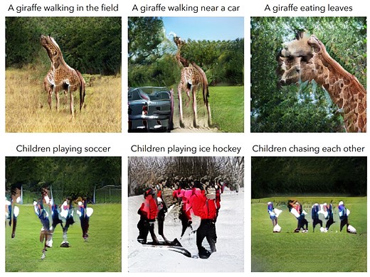 For example, a human, when given a caption, could sketch a concept drawing that presents a logical interpretation of how the captioned scene may look in the real world, such as computer monitors likely sitting on a desk, a skier likely being on snow and bicycles likely being located on pavement.