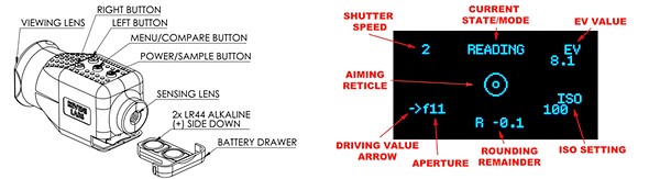 On the top of the Reveni Labs Spot Meter are four buttons: right and left directional buttons, a menu/compare button, and the power/sample button. Beneath the sensing lens on the front of the spot meter is the battery compartment, which holds a pair of LR44 alkaline batteries to power the device. Through the viewing lens at the back, you see the OLED display, which shows shutter speed, current state, EV value, ISO, rounding remainder, aperture, and driving value arrow surrounding the central aiming reticle.