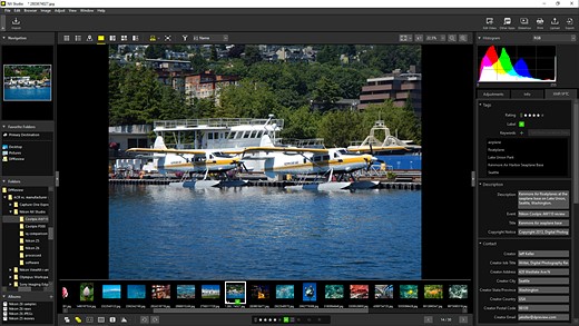 The navigation panel, folders and albums controls are all fixed at screen left, while the histogram, adjustments, EXIF information and keywording tools sit at the right of the screen. Both of these side panels can easily be resized, or hidden with a single click on their centrally-located arrow buttons. The film strip lacks a similar button to allow it to be hidden, but you can hide it by dragging downwards when resizing.
