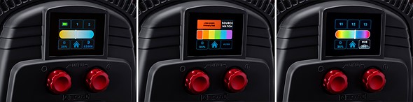 The color control menus of the two Rotolight heads from left to right, Color Correction Temperature, Filter packs and the Hue/Saturation/Intensity displays. Each is quick and easy to use. |