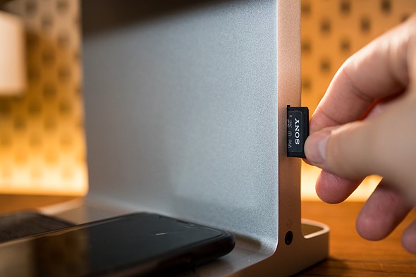 On the left-hand side of the stand, Kensington includes a USB-C port and a power button. On the right-hand side is a UHS-II SD card reader and a standard 3.5mm audio jack for both inputting and outputting audio.
