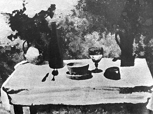 Another image, of a set table, was made using a glass plate, which created a negative. The plate no longer exists, but a halftone print of the image still does. The date is not known (speculated to be around 1830), but the improved quality of the image shows Niepce had refined his techniques significantly. From his notes and other information, though, it is known the exposures still took hours in good sunlight.