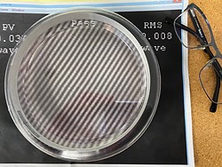 This is a 15 cm diameter, 1/10 wavelength optical flat, eyeglasses for scale. |