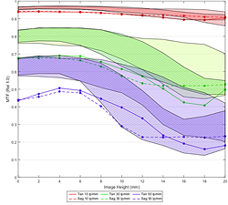 If you want to look at what I do when I set standards, here are the MTF graphs of multiple copies of two different 35mm F1.4 lenses. The dotted lines show the mean of all the samples; these are the numbers I give you when I publish the MTF of a lens. The colored area shows the range of acceptability. If the actual MTF of a lens falls within that range, it meets my standards.