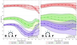 Mean (lines) and range (area) for two 35mm lenses. The mean is pretty similar, but the lens on the right has more variation. |