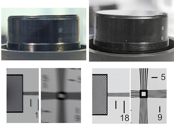 | On top you see the 9th element ‘popped out’ (left) and replaced (right). Below each is the picture of a test chart made with the lens in that condition. |