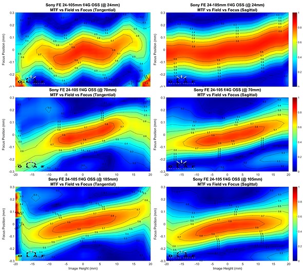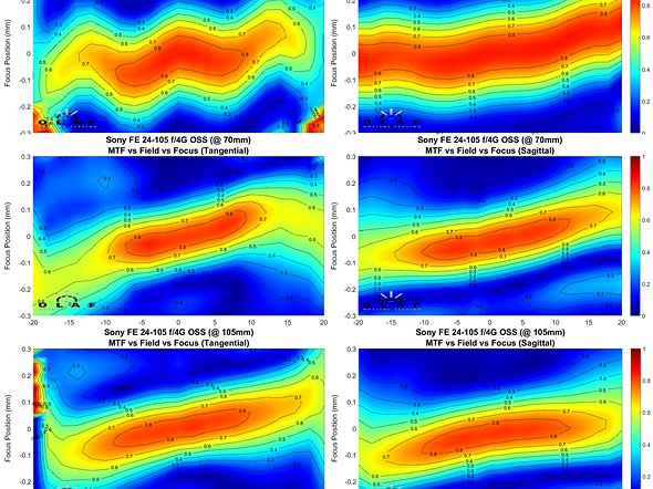 Just one more example of typical zoom tilt, a Sony 24-105mm F4G OSS. This one has the same tilt throughout the zoom range. Note also that the field curvature changes a lot between 24mm and 70mm, but not much after that.