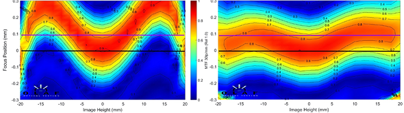 | These plots show field curvature of the Voigtlander Nokton 35mm F1.2. Stopping down won’t mask the effects of this curvature if you center focus (black line), but focusing off axis (purple line) can. |