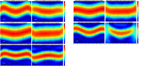 If you mentally overlay the sagittal and tangential curves, the Canon 85mm F1.2 has a field curving back to the camera with a fair amount of off-axis astigmatism. The Sigma and Sony lenses have less curvature and less astigmatism. The Canon 85mm F1.4 has flatter field, but does have off-axis astigmatism; the sagittal and tangential curves are in almost opposite directions. The Xeen has similar curve to the Canon F1.2, but the tangential field never gets sharp at the edges.