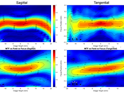 I’m going to use just one type of graph, hopefully minimizing the chaos I so often create. Sagittal field curve on the left, tangential on the right, and the graph curving up towards the top means the field is curving back towards the camera.