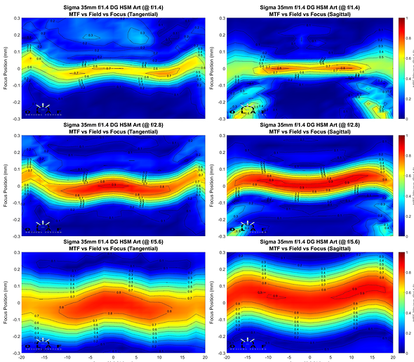 The Zeiss Milvus 21mm F2.8, for example, has a wicked field curvature, but great sharpness and very little astigmatism. The Sigma 24mm Art has less curvature but still very little astigmatism. The ‘Bat signal’ tangential curve of the Nikkor 24mm F1.4 and the vibrating tangential curve of the Canon 24mm F1.4L almost show the strain of trying to flatten that field.