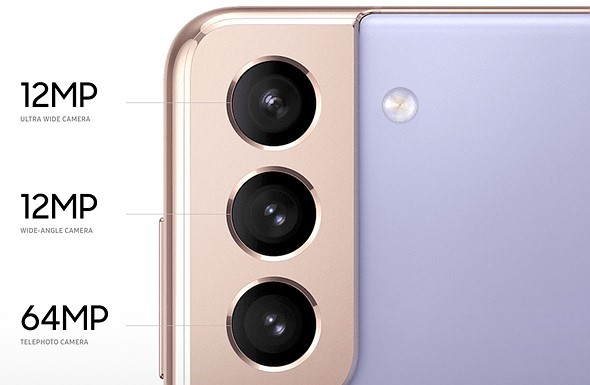 The two-tone design of the Galaxy S21/S21 Plus works around the camera protrusion. The camera system is basically the same on these models as it was last year. The S21 and S21 Plus each include a 12MP wide-angle camera, 12MP ultrawide camera and a 64MP telephoto lens. The front-facing camera is 10MP, although the S21 Plus has ditched the depth sensor.