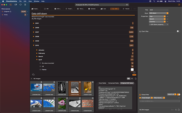 Once the app scans the EXIF data, you can filter against all imported EXIF dimensions and visualize your photos using histograms, pie charts, pivot tables, pivot charts, and a drill-down discovery tool. You can choose to export your charts as PNG files or export the raw data in CSV format. You can save the analyses and refresh results as you add additional images to your archives in PhotoStatistica.