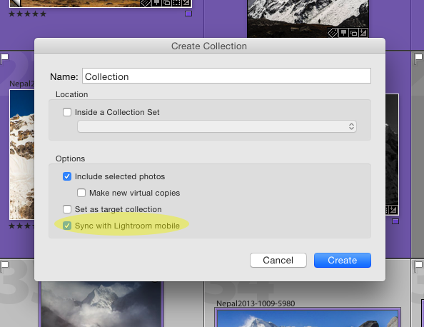 Lightroom Mobile will currently only work with Collections. If you need help setting up a Collection, the free Adobe video here will help. To enable a Collection for syncronization, simply right click on the Collection and choose “Sync with Lightroom mobile”. Pretty easy!