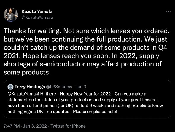 The information came from a quote tweet shared by Yamaki in response to a United Kingdom resident who inquired about the production and supply of three particular Sigma lenses he’s been unable to find in any local retailers. In response, Yamaki says despite continuing at full production, Sigma ‘just couldn’t catch up [to] the demand of some products in Q4 2021]. It’s the next sentence, however, that’s notable.