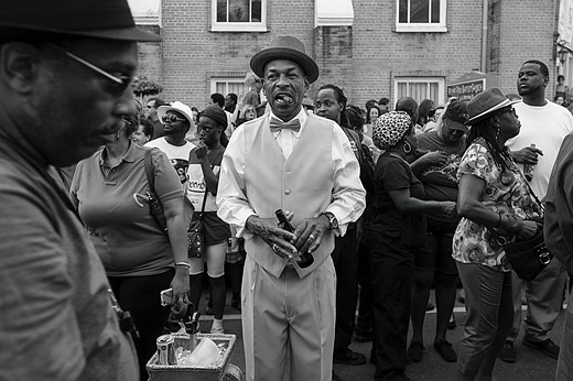 About this Series: This series documents a second line parade, which is an element of a jazz funeral procession that is composed of two parts: The main or “first line” that includes the parade leader, the brass band and the krewe or club with which the band is affiliated, and members of the funeral party. The “second line” is made up of spectators—friends of the deceased, neighbors, and even tourist—who follow the main line dancing, partying, and reveling in the moving spectacle. A second line often give the appearance of a being block party on the move.