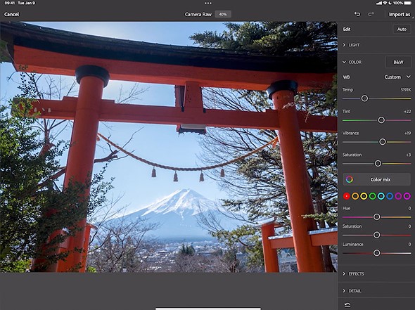 When finished editing, you can then open your raw image as a smart object inside Photoshop on iPad, maintaining a non-destructive workflow and the option to go back and make additional adjustments in Camera Raw at any point in the editing process.