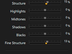 Under the structure header, you get both the basic structure control and one for fine structure, as well as individual controls for structure in the highlight, midtone and shadow areas. And finally, the tonality protection section contains sliders to recover lost detail in just the highlight and shadow areas of the image.