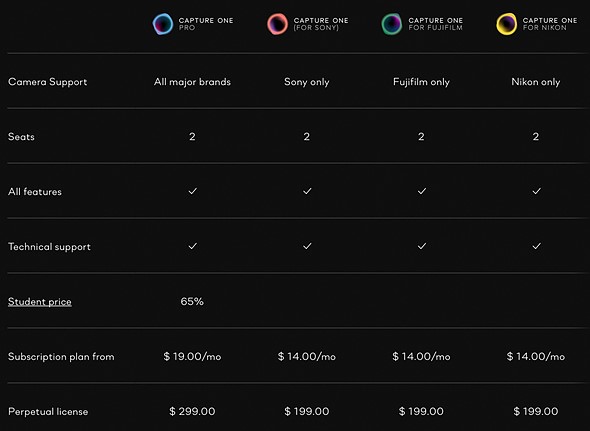| Current subscription pricing for Capture One. The branded versions now start at $14/month, whereas they were previously $9.99/month. Click to enlarge. |