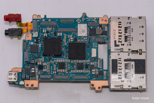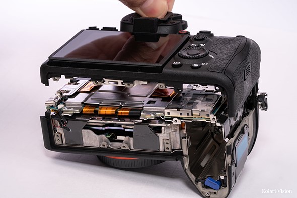 After unpacking the a1, layer by layer, Kolari Vision made its way to the primary circuit board and the dual Bionz XR processor. These are the brains of the operation and drive the a1’s impressive performance, including full-resolution RAW image capture at 30 frames per second. There are a lot of wires and ribbons inside the a1, including some that have changed from being clip-in connectors to press-on connectors. Kolari Vision writes that there are pros and cons to those. Press-on connectors can be easier to remove, but trickier to put back on.